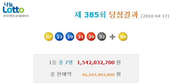 4¿ù 17ÀÏ ½Ç½ÃµÈ Á¦385ȸ ³ª´® ·Î¶Ç 1µî ´ç÷¹øÈ£´Â '7, 12, 19, 21, 29, 32'¹øÀ̸ç, 2µî º¸³Ê½º ¹øÈ£´Â 9¹øÀÌ´Ù. À̹ø ȸÂ÷ ³ª´®·Î¶ÇÀÇ ÃÑ ÆÇ¸Å±Ý¾×Àº 462¾ï4300¸¸¿øÀ̾úÀ¸¸ç, ÀÌÁß 1µî ´ç÷ÀÚ´Â 7¸íÀ¸·Î 1Àδç 15¾ï4200¸¸¿ø¾¿ ¹Þ°Ô µÈ´Ù.