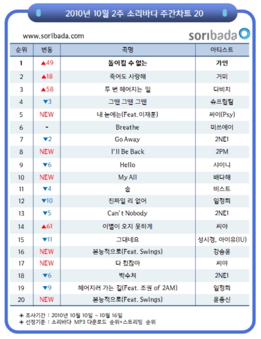 ¿©ÀÚ °¡¼öµéÀÇ ³ë·¡ 6°îÀÌ 10À§±Ç ³»¿¡ ¾ÈÂøÇÏ¸ç ¿©Ç³(åüù¦)ÀÇ °¼¼¸¦ È®ÀÎÇÒ ¼ö ÀÖ¾ú´Ù. 2À§´Â SBS µå¶ó¸¶ ¡®´ë¹°¡¯ÀÇ ¿£µù ŸÀÌÆ²°îÀÎ °Å¹ÌÀÇ ¡®Á׾ »ç¶ûÇØ¡¯°¡ Â÷ÁöÇß´Ù. È£¼Ò·Â £Àº °Å¹ÌÀÇ ¸ñ¼Ò¸®¿¡ ¾ÖÀÜÇÑ ÇÇ¾Æ³ë ¼±À²ÀÌ µ¸º¸ÀÌ´Â ¡®Á׾ »ç¶ûÇØ¡¯´Â µå¶ó¸¶ Àαâ¿Í ´õºÒ¾î ¼öÁ÷ »ó½Â ÁßÀÌ´Ù. 3À§´Â ½Å½ÂÈÆ 20Áֳ⠾ٹü¿¡ Âü¿©ÇÑ ´ÙºñÄ¡ÀÇ °¨¼ºÀûÀÎ ¹ß¶óµå°î ¡®µÎ ¹ø Çì¾îÁö´Â ÀÏ¡¯ÀÌ ·©Å© µÆÀ¸¸ç, ¹Ì¾²¿¡ÀÌÀÇ ÀÚ¸ÞÀÌÄ« ·¹ÄÉÅæ ¸®µëÀÇ ÈÄÅ©¼Û ¡®Breathe(ºê¸®µå)¡¯°¡ 6À§¿¡ ¾ÈÂøÇß´Ù. 2NE1ÀÇ ¡®Go Away(°í¿ì ¾î¿þÀÌ)¡¯¿Í õ»óÀÇ ¸ñ¼Ò¸® ¹è´ÙÇØÀÇ SBS µå¶ó¸¶ ¡®´ÚÅÍèÇÁ¡¯ OST ¼ö·Ï°îÀÎ ¡®My All(¸¶ÀÌ ¿Ã)¡¯ÀÌ °¢°¢ 7À§¿Í 10À§¿¡ À̸§À» ¿Ã¸®¸ç »óÀ§±Ç¿¡ ¾ÈÂøÇß´Ù.