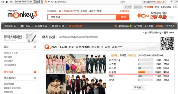 ÃÖ±Ù À½¾ÇÀü¹®»çÀÌÆ® ¸ùŰ3°¡ ½Ç½ÃÇÑ ¡®ÀϺ» ÁøÃâ¿¡ ¼º°øÇÒ °Í °°Àº °¡¼ö´Â¡®À̶õ ¼³¹®Á¶»ç¿¡¼ À̽±Ⱑ 522¸í Áß 45%(234¸í)À¸·ÎºÎÅÍ ÁöÁö¸¦ ¹ÞÀ¸¸ç 1À§¸¦ Â÷ÁöÇß´Ù.