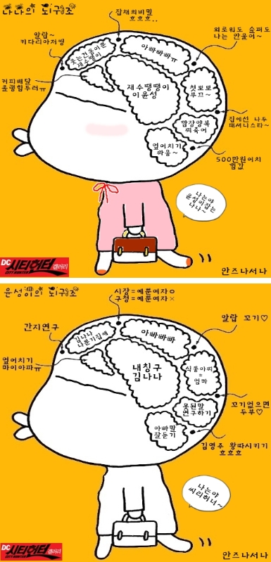 À±¼ºÀÇ ³ú±¸Á¶¿¡´Â ¡®³» Ä£±¸ ±è³ª³ª¡¯°¡ °¡Àå Å« °ü½É»ç·Î Áß¾ÓÀ» Â÷ÁöÇϰí ÀÖÀ¸¸ç ±× ÁÖÀ§¸¦ µÑ·¯½Î°í ³ª³ª¿¡ ´ëÇÑ »ý°¢µéÀÌ ³ª¿µÅÀÖ´Ù. À±¼ºÀÌ ³ª³ª¿¡°Ô ¾÷¾îÄ¡±â¸¦ ¿©·¯ Â÷·Ê ´çÇÑ ÈÄ »ý°¢ÇÑ ¡®¾÷¾îÄ¡±â ¸¹ÀÌ ¾ÆÆÄ¡¯, ÁøÂ¥ ¼Ó¸¶À½°ú´Â ´Þ¸® ³ª³ª¿¡°Ô ÀϺη¯ ±îÄ¥ÇÑ Åµµ¸¦ º¸À̰í ÀÖ´Â À±¼ºÀÇ ¸¶À½ÀÌ °í½º¶õÈ÷ ´ã±ä ¡®¸øµÈ ¸» ¿¬±¸Çϱ⡯ µî ÀçÄ¡ÀÖ´Â »ý°¢µéÀÌ Àç¹Ì¸¦ ÁÖ°í ÀÖ´Ù.