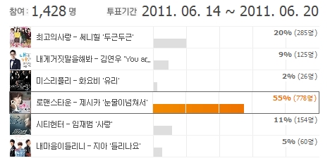 Áö³ 6¿ù 14ÀϺÎÅÍ 20ÀϱîÁö ÃÑ 1,428¸íÀÌ Âü¿©ÇÑ ÅõÇ¥ °á°ú, ¼Ò³à½Ã´ë Á¦½ÃÄ«°¡ ºÎ¸¥ ¡®·Î¸Ç½ºÅ¸¿î¡¯ÀÇ ¡®´«¹°ÀÌ ³ÑÃ°¡ ÃÑ 55%(778¸í)ÀÇ µæÇ¥À²À» ¾ò¾î 1À§¿¡ ¿Ã¶ú´Ù. ¡®·Î¸Ç½ºÅ¸¿î¡¯Àº 100¾ï ¿ø »ó´çÀÇ ·Î¶Ç¿¡ ´ç÷µÈ 20´ë ÀÔÁÖ °¡»ç°ü¸®»çÀÇ ÁÂÃæ¿ìµ¹À» ±×¸° µå¶ó¸¶´Ù. ¼ºÀ¯¸®¿Í ¹ÎÈ¿¸°, Á¤°Ü¿î°ú ±è¹ÎÁØ µî È·ÁÇÑ ¹è¿ìµéÀÌ Ã⿬ ÁßÀÌ´Ù. ¡®´«¹°ÀÌ ³ÑÃ´Â ¼ºÀ¯¸®¿Í Á¤°Ü¿îÀÇ ·¯ºê Å׸¶°îÀ¸·Î ÈÁ¦¸¦ ¸ðÀ¸°í ÀÖ´Ù.