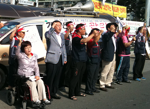 ¼¼Àϱ³Åë³ëµ¿Á¶ÇÕ¿ø(¹ÎÁÖ³ëÃÑ °ø°ø¿î¼ö³ëÁ¶ ¹ÎÁÖ¹ö½ºº»ºÎ ¼Ò¼Ó)µéÀÌ 7¿ù 11ÀϺÎÅÍ ÇöÀç±îÁö °íÇö½Ã¿Ü¹ö½ºÅ͹̳Π¾Õ¿¡¼ ³ó¼º ÁßÀÌ´Ù.