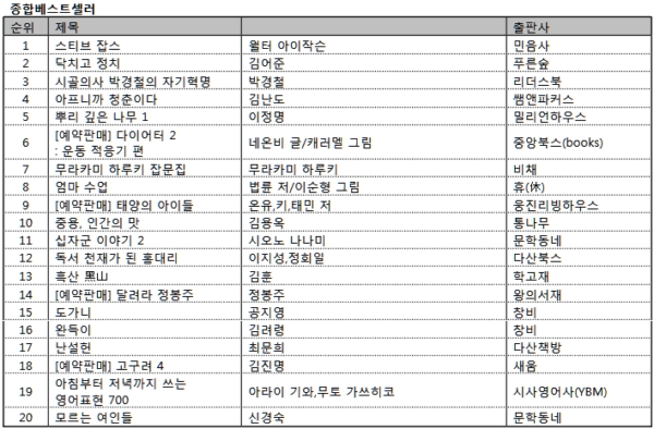 7À§´Â ¹«¶óÄ«¹Ì ÇÏ·çŰÀÇ ¿¡¼¼ÀÌÁý <Àâ¹®Áý>ÀÌ Â÷ÁöÇß´Ù. <1Q84>ÀÇ ¿¹·ç»ì·½»ó ¼ö»ó ¼Ò°¨À¸·Î À¯¸íÇÑ 'º®°ú ¾Ë'À» ºñ·ÔÇØ ±×ÀÇ Àλý°üÀÌ ´ã±ä ¿¡¼¼À̸¦ ¸ð¾Ò´Ù. 8À§´Â ¹ý·û½º´ÔÀÇ <¾ö¸¶¼ö¾÷>ÀÌ Â÷ÁöÇß´Ù. ¾ÆÀ̵¹±×·ì »þÀÌ´ÏÀÇ ¿ÂÀ¯, Ű, ŹÎÀÇ ¹Ù¸£¼¿·Î³ª ¿©Çà±â <žçÀÇ ¾ÆÀ̵é>ÀÌ ¿¹¾àÆÇ¸Å·Î 9À§¿¡ ¿Ã¶ú´Ù. ±è¿ë¿ÁÀÇ <Áß¿ë, Àΰ£ÀÇ ¸À>Àº 10À§¿¡ ¸Ó¹°·¶´Ù. 11À§´Â ½Ã¿À³ë ³ª³ª¹ÌÀÇ <½ÊÀÚ±º À̾߱â 2>°¡ Â÷ÁöÇß´Ù.