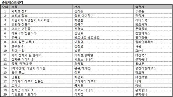 ÀüÁÖ 10À§±Ç µµ¼¿´´ø ±è¿ë¿ÁÀÇ <Áß¿ë, Àΰ£ÀÇ ¸À>ÀÌ 13À§, ¹«¶óÄ«¹Ì ÇÏ·çŰÀÇ <¹«¶óÄ«¹Ì ÇÏ·çŰ Àâ¹®Áý>ÀÌ 17À§¸¦ ±â·ÏÇß°í, ÀÌÁö¼ºÀÇ <¸®µùÀ¸·Î ¸®µåÇ϶ó>°¡ Á¾ÇÕ º£½ºÆ®¼¿·¯ 20À§¿¡ ÀçÁøÀÔÇß´Ù.
