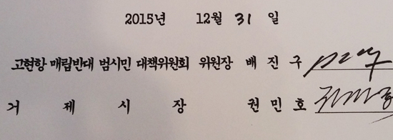 °íÇöÇ׸Ÿ³¹Ý´ë´ëÃ¥À§ ¹èÁø±¸ À§¿øÀå°ú ±Ç¹ÎÈ£ ½ÃÀåÀº ±¸¶ø 31ÀÏ °íÇöÇ×»ç¾÷°ú °ü·ÃÇÑ ¡®ÇÕÀǼ¡¯¿¡ ¼¸íÇß´Ù.