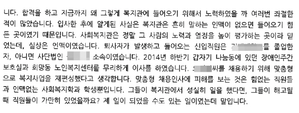 ÁøÁ¤¿¡´Â ¡°±×µéÀÌ º¹Áö°ü¿¡¼ ¼º½ÇÈ÷ ÀÏÀ» Çß´Ù¸é ±×µéÀÌ ÇØ°íµÉ ¶§ Á÷¿øµéÀÌ °¡¸¸È÷ ÀÖ¾úÀ»±î¿ä. ÀúÀÇ ÀÏÀÌ µÇ¾úÀ» ¼öµµ ÀÖ´Â ÀÏÀ̾ú´Âµ¥ ¸»ÀÔ´Ï´Ù¡± ¶ó°í ¹Ý¹®ÇÏ´Â ³»¿ëµµ ÀÖ´Ù.