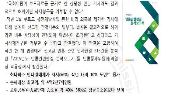ÀÌ ÆÇ°áÀ» Æ÷ÇÔÇÏ¿© ÀÛ³â ÇÑ ÇØ ¹ý¿ø¿¡¼ ¼±°íµÈ ¾ð·Ð °ü·Ã ¹Î»çÆÇ°á 215°ÇÀ» ºÐ¼®ÇÑ ¡®2015³âµµ ¾ð·Ð°ü·ÃÆÇ°á ºÐ¼®º¸°í¼¡¯ ¸¦ ¾ð·ÐÁßÀçÀ§¿øÈ¸(À§¿øÀå ¹Ú¿ë»ó)¿¡¼ ¹ß°£Çß´Ù.