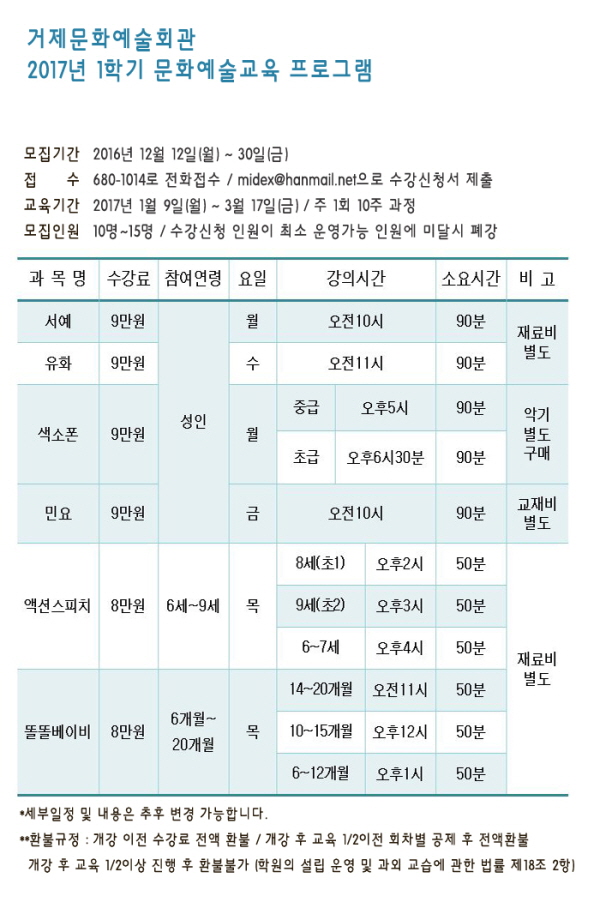 °ÅÁ¦½Ã¹®È¿¹¼úÀç´Ü(ÀÌ»çÀå ±Ç¹ÎÈ£)Àº 2017³â 1Çб⠹®È¿¹¼ú±³À° ÇÁ·Î±×·¥À¸·Î ÆÇ¼Ò¸®¿Í ¹Î¿ä, ¼¿¹, À¯È, »ö¼ÒÆù, ¶Ê¶Êº£À̺ñ, ¾×¼Ç½ºÇÇÄ¡ µî ¿¹¼ú °Á¸¦ ¸¶·Ã, ¿À´Â 12¿ù 12ÀÏ(¿ù)ºÎÅÍ ¼ö°½ÅûÀ» ¹Þ´Â´Ù.