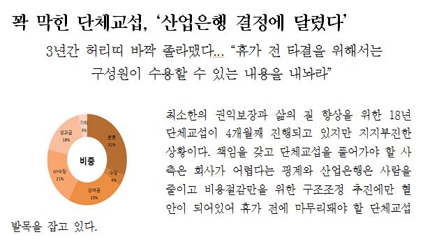 ²Ë ¸·Èù ´Üü±³¼·À» Ç®¾î³ª°¡±â À§ÇØ ³ëµ¿Á¶ÇÕÀº »óÈ£ ÀÔÀåÀ» Á¼Çô³ª°¡±â À§ÇØ ¸ÅÀϱ³¼·À» Á¦¾ÈÇÏ´Â µî ÇØ°áÀÇ ½Ç¸¶¸®¸¦ ã°íÀÚ ³ë·ÂÇϰí ÀÖ´Ù. ÇÏÁö¸¸ µ· ÁÙÀ» Áã°í ÀÖ´Â »ê¾÷ÀºÇàÀÌ °áÁ¤À» ÇÏÁö ¾Ê´Â´Ù¸é ÈÞ°¡ Àü Ÿ°áÀº ¹° °Ç³Ê °¥ ¼ö ÀÖ´Ù. °æ¿µÁøÀ» Á¦¾îÇÏ°í ³ë»ç°ü°è¸¦ ÁÂÁö¿ìÁö ÇÏ´Â »ê¾÷ÀºÇàÀÇ °á´Ü¿¡ µû¶ó ³ëµ¿Á¶ÇÕÀÇ ÅõÀïµµ ´Þ¶óÁú ¼ö ÀÖ´Ù. 18³â ´Üü±³¼· ¿ø¸¸ÇÑ ÇØ°áÀ» À§Çؼ´Â ³ë»ç°ü°è¸¦ ±í¼÷ÀÌ °³ÀÔÇϰí ÀÖ´Â »ê¾÷ÀºÇàÀÇ °áÁ¤¸¸ ³²¾Ò´Ù.